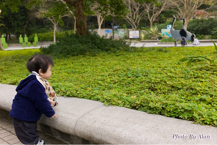 經過門口的紅鶴, 先搭遊園車到高處再向下走. 等得不耐煩哭哭的乖乖, 上了車就笑呵呵.