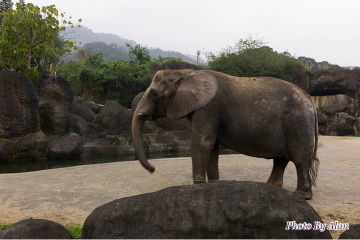 至於大象, 也不知為什麼, 總之, 在抱著乖乖站定後, 一頭大象走了過來, 在我們面前走過到一旁去把鼻子架起來. 接著另一頭大象也過來在我們前頭走動. 看看用 35mm 小廣角, 就能拍到那麼近的大象, 就知道我們有多接近.