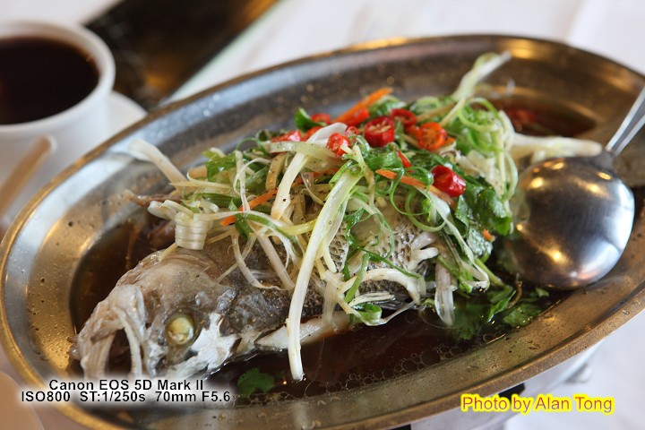清蒸鮮魚(NT480), 今天的魚是鱸魚, 也是點給乖乖吃的, 調味清爽, 鱸魚雖不很香, 但也不錯吃. 結果本餐投資最高的菜色, 乖乖一點兒也不捧場. 平常愛吃豆酥鱈魚, 清蒸魚的乖乖, 是一口也不吃.