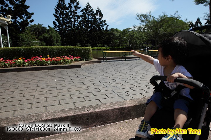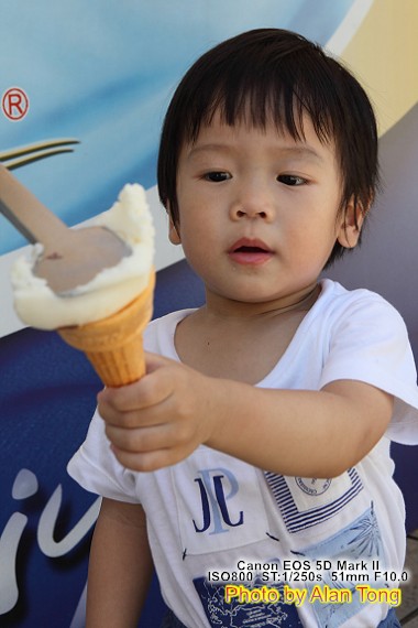乖乖邊吃冰( 其實舔了二口, 就不吃了 ), 眼光還不時瞄向另一邊的風火輪, 喜歡嗎? 爸爸帶你到正面看. 乖乖到了正面, 就大喊"怕怕, 怕怕"... 算了, 回陰影下吃冰.