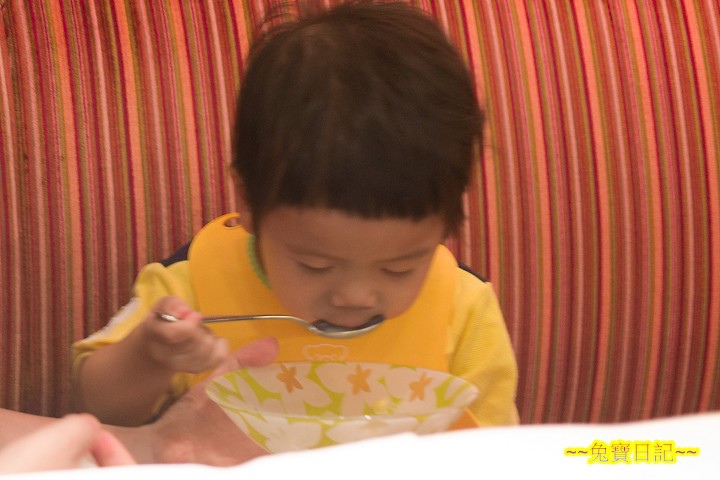 吃飯要自己吃, 不要爸媽餵, 尤其是喝到好喝的魚湯, 吃到香甜的西瓜, 摩摩喳喳, 更是會一把抓下 JA 手中的湯匙或小叉子, 自己快速地大快朵頤.