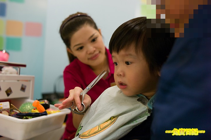 餐後, 找到了魔法屋, 離預訂時間還有十分鐘, 先讓乖乖看其他小朋友剪髮. 我們預約的魔法師, Zoe, 剛好在門邊為前個小朋友剪髮. 看乖乖一副平靜的樣子, 看來這次是沒問題的了.