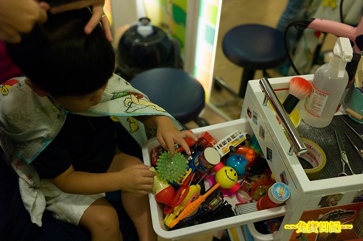經過有轉折的吹風機把髮屑吹掉後, 就是乖乖挑玩具時間囉. 挑過玩具的乖乖, 似乎忘了自己剛剛是怎麼嚷嚷不要坐車, 直說下次還要剪...