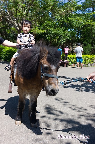 (照片在是六福村體驗原地騎小馬的乖乖. 工作人員牽了年紀約八歲, 較穩定的小馬"嘟嘟"讓現場的小朋友試乘. )