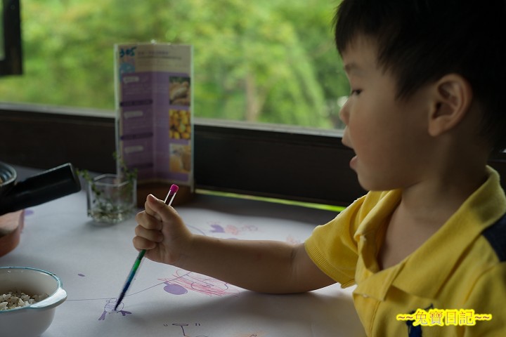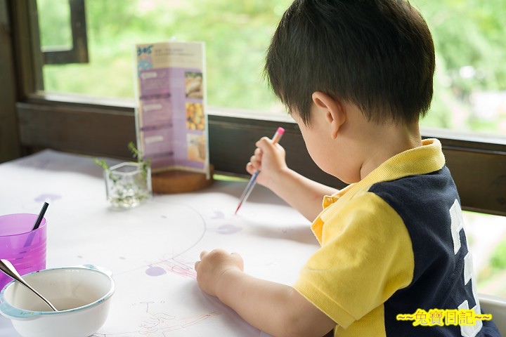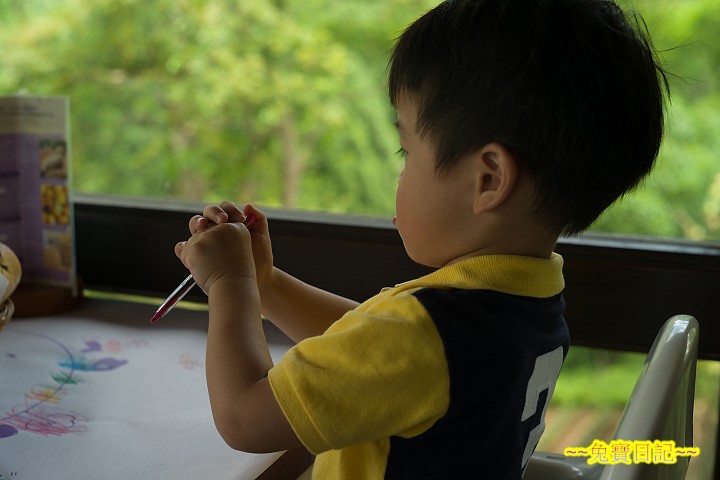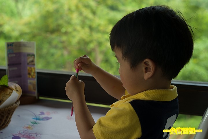 今早去薰衣草森林, 乖乖拿了小朋友常有的多節彩色筆在畫畫.