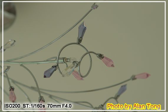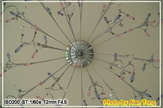 除了解開文化石的謎團, 再看看水晶燈的原貌. 即使沒有點著, 客廳的主燈, 仍漾著浪漫的粉紫, 粉紅.