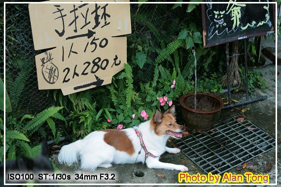 餐點上來不多久的當兒, 老闆把室內睡覺的 HERO 牽出來解放, 順便和阿胖打招呼, 既然到了室外, 拍照沒禁忌, A 拍了幾張 HERO 的照片, 不過黑呼呼的主角, 可需要不錯的技巧, 這 A 倒沒有, 亂槍掃了一陣子, 勉強還有一張能看.