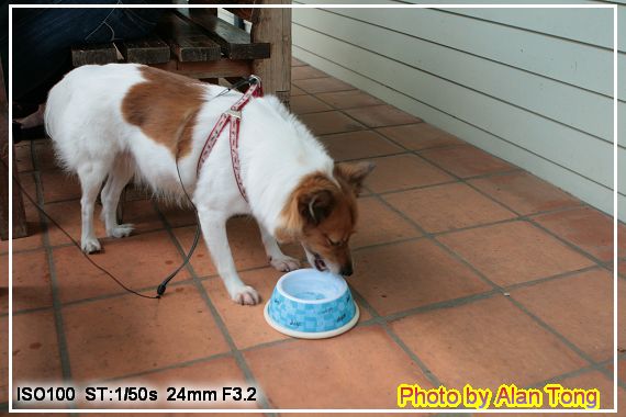 待得十一點時分, 帶著狗子們一起進入花想容. 帶著小狗只能坐在室外, 所幸那天炎熱的天氣在坐定不久, 開始吹起了徐徐的涼風, 坐在室外也不怎麼難受. 菜單送上來的同時, 老闆為狗狗準備的藍色水碗也一起登場, 別人家碗裡的水終是特別好喝, 黃胖當然不會錯過.