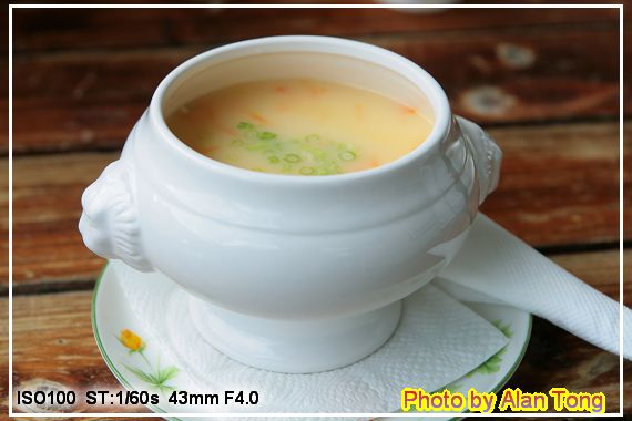 餐點上桌, 前湯是玉米濃湯, 湯頭中滿是玉米, 一個不小心可是會喝飽的.