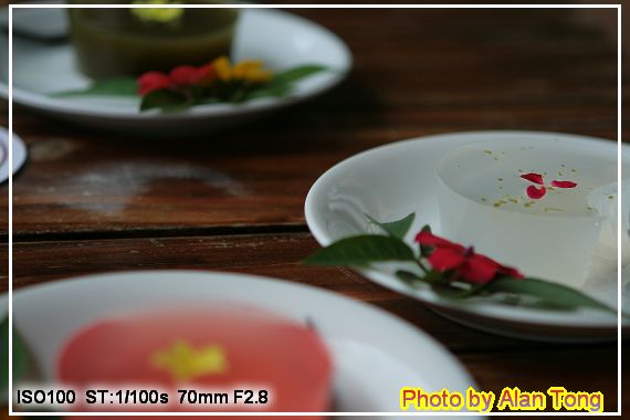 餐後的點心, 可選花茶凍或餅乾, 口味都普通, 不過花茶凍做得十分漂亮, 還有美麗的現採鮮花布置.