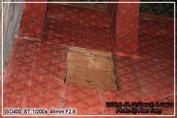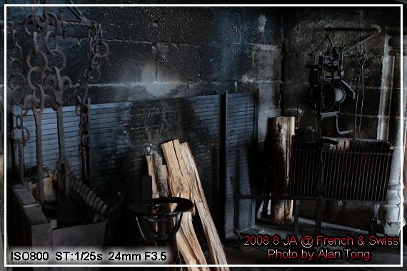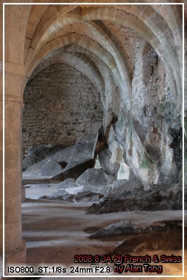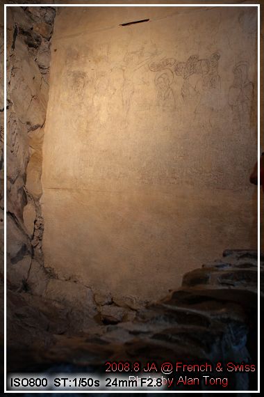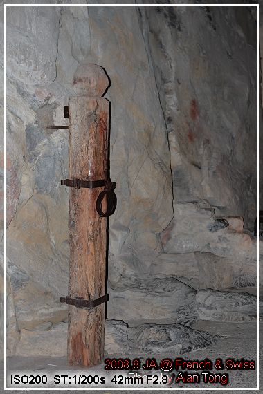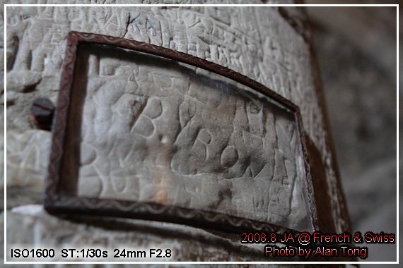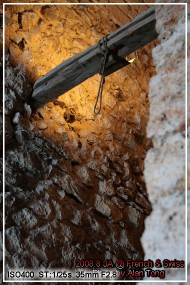 說到關人, 進入 Chillon 古堡, 首先要去看的, 就是囚禁犯人之處, 幽暗的光線, 粗糙挖開的空間, 想當然爾, 環境很糟, 而且犯人一天只得一次上洗手間的機會. 不過這兒會成為 Chillon 古堡最著名一處的原因, 是因為有位詩人, 拜倫, 除了寫了一篇"奇龍囚徒"的作品外, 還很沒有公德心地在囚室的柱子上, 刻下了"拜倫到此一遊"的紀念. 然後... 我們亂刻叫沒公德心, 名人亂刻就是重要的文化資產, 還得費工做個框框來保護這個簽名.