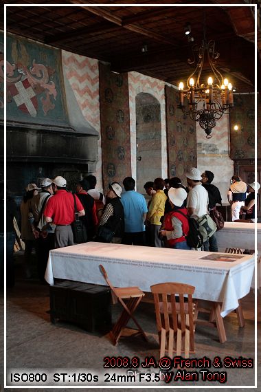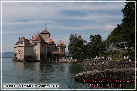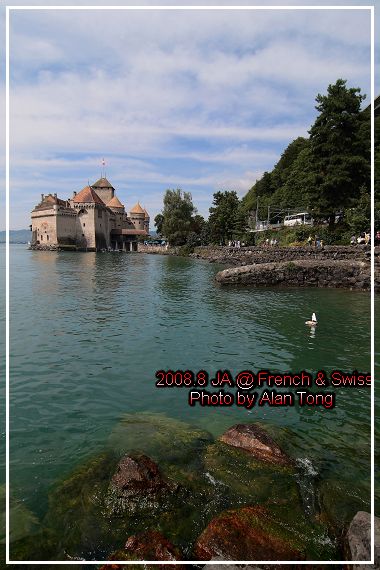 Chillon 古堡, 旅遊書和我們參加的旅行團都以音譯為"奇龍"古堡, 於是 A 心裡想到的是, 這古堡是不是有著屠龍的傳奇, 還是有龍住在裡頭的故事, 不過很抱歉, 沒有... 這古堡, 和龍是一點關係都沒有. 而 Chillon 是"石頭"的意思, 所以也有人譯成"石庸"古堡, 勉強算是音義兼顧, 至少不會讓人胡思亂想, 以為裡頭有龍的傳奇.