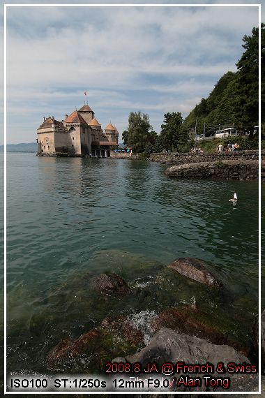 趁著一點自由時間, 往古堡碼頭延伸的步道逛逛, 在步道中間處, 有一突出讓遊客乘船的碼頭, 由碼頭回拍古堡, 是能拍下整座古堡的好地點. 天氣不錯的藍天白雲, 碧綠的湖水, 近處岩石上的綠苔, 以及雄立湖畔的 Chillon 古堡, 構成美麗的畫面, 為 Chillon 古堡的行程, 留下美麗的句點. (本篇的第一張照片有後製, 把天空拉暗點, 水面石頭拉亮些)